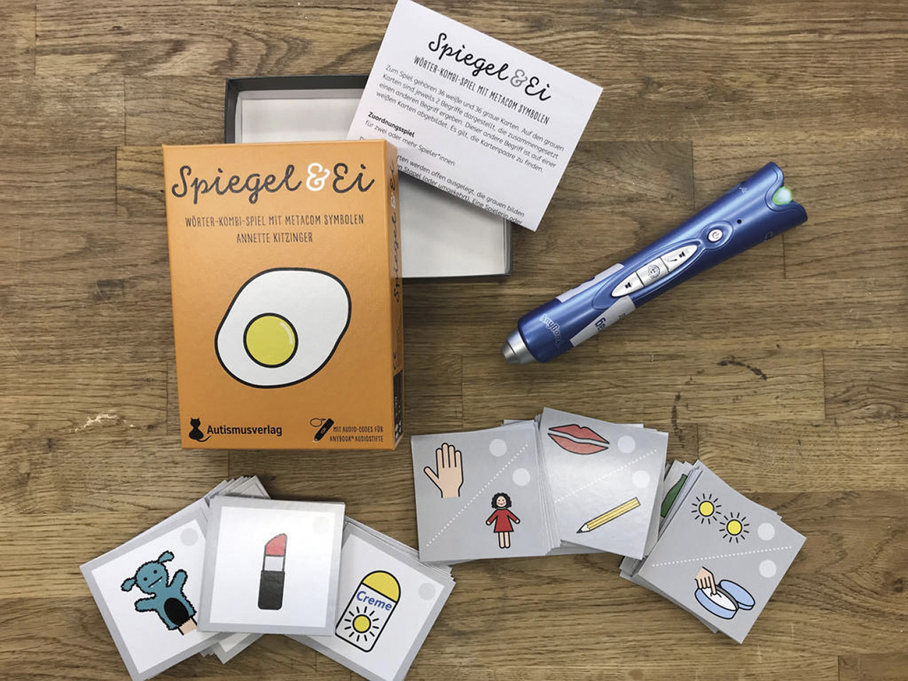 Zum Spiel gehören 36 weiße und 36 graue Karten. Auf den grauen Karten sind jeweils 2 Begriffe dargestellt, die zusammengesetzt einen anderen Begriff ergeben. Dieser andere Begriff ist auf einer weißen Karte abgebildet. Auf allen Karten befinden sich Anybook Audiocodes, mit denen der Audiostift die abgebildeten Begriffe ausspricht. So können die Spielmöglichkeiten erweitert und Sprachbarrieren ausgeglichen werden.
